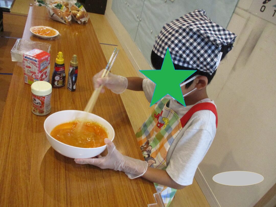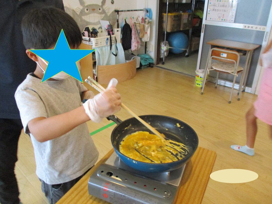 卵を自分たちで割り、塩・コショウで味付けをしスクランブルエッグを作りました。ウィンナーを焼いたりシーチキンにマヨネーズを混ぜたり、ホイップクリームの上に季節の柿をのせて食べました。