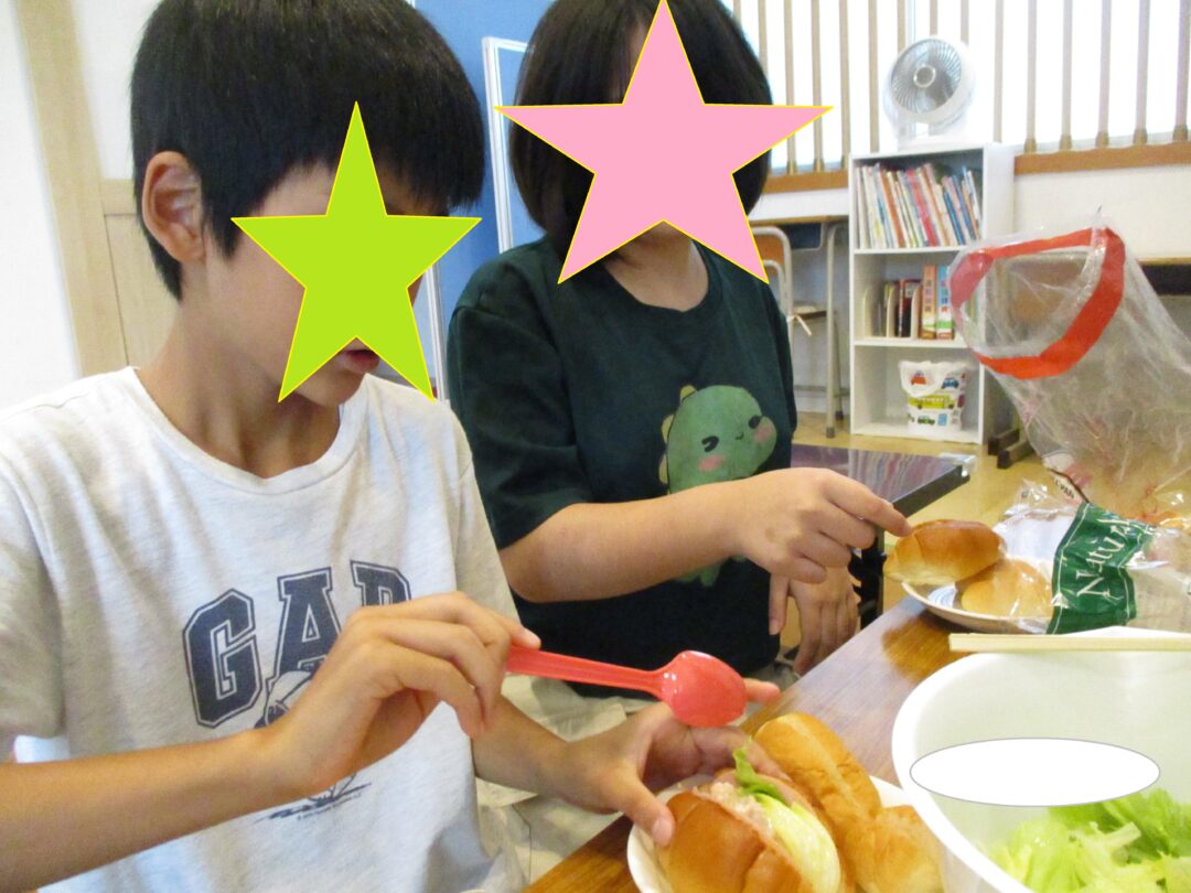 子ども達は自分の好きな具を、パンの上にのせて挟んで食べました。「先生、出来たよ~っ!見て」と