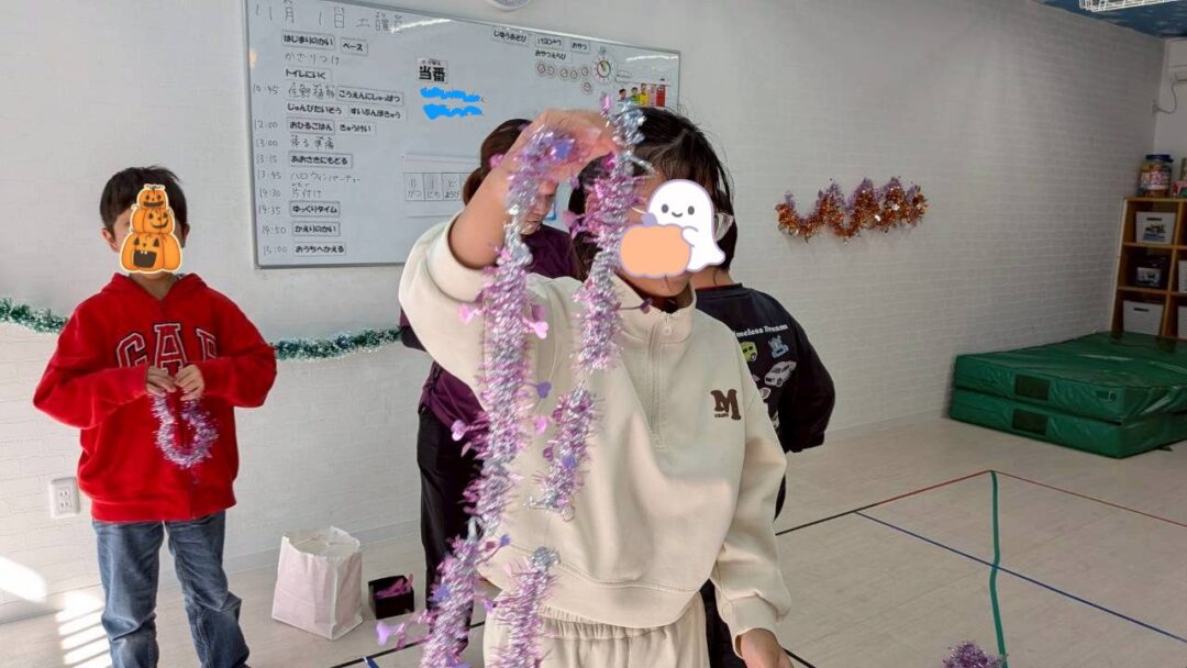 最初にみんなで飾りつけをして、部屋がハロウィン一色に(^^♪