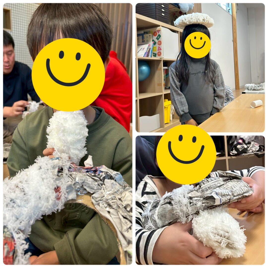 段ボールや新聞紙に毛糸を巻いて、