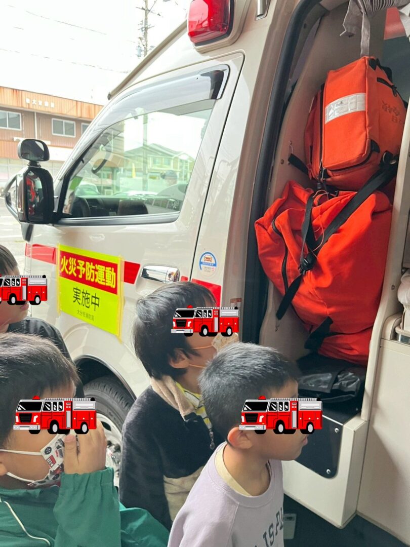 消防士さんから「地震の時には家のブレーカーを落とす事」「火事を防ぐために家のコンセントのほこりをこまめにとること」「火のついたタバコのポイ捨てをみかけたらすぐに近くの大人にしらせること」など大切なお話をしていただきました(*^_^*)