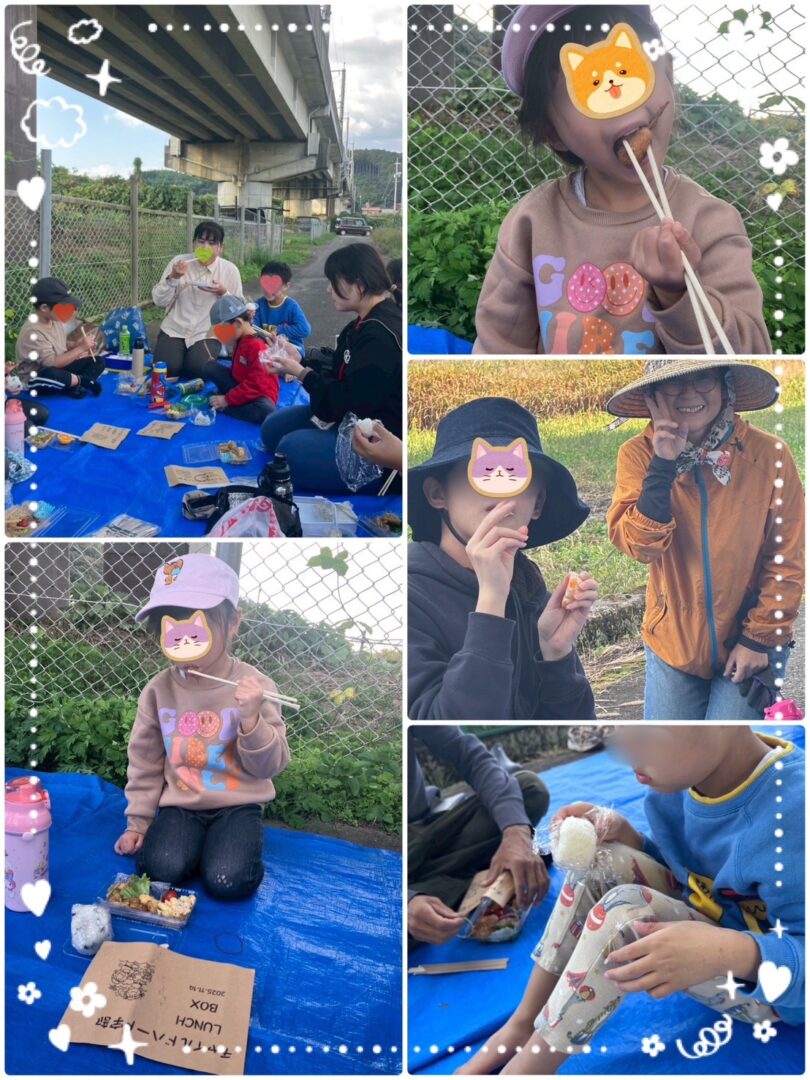 深く掘れば掘るほど出てくるお芋に目を輝かせながら「わぁ!おっきい!!」「みて、みてー!」と、大喜びの子ども達でした。最年長のTくんは職員と一緒に黙々とスコップで土を掘り起こしてくれていました。その姿に大きな成長を感じることが出来ました。自然の恵みを育んでくださった邑岡農園の邑岡さんに感謝です。お芋ほりの後はスタッフ手作りのチャイルド弁当を邑岡さんも一緒にみんなでシートを敷いて食べました。身体を動かした後のお弁当の味は格別だったことでしょう。