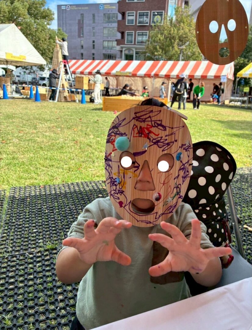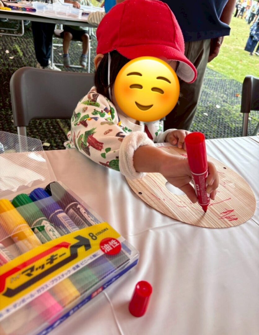 木のお面にマジックペンで絵を描いたり、シールを貼ったりして、世界に一つだけのオリジナルお面作りに夢中になっていました(≧▽≦)