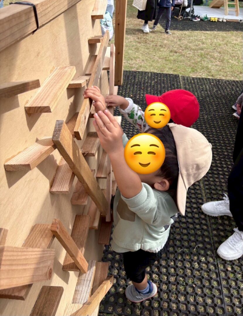 木材で作られたピタゴラ迷路にボールを転がしたり、積み木でタワーを作ったりして、子ども達は木のぬくもりを存分に感じながら遊びました✨