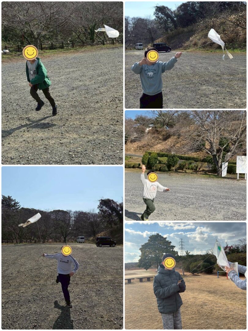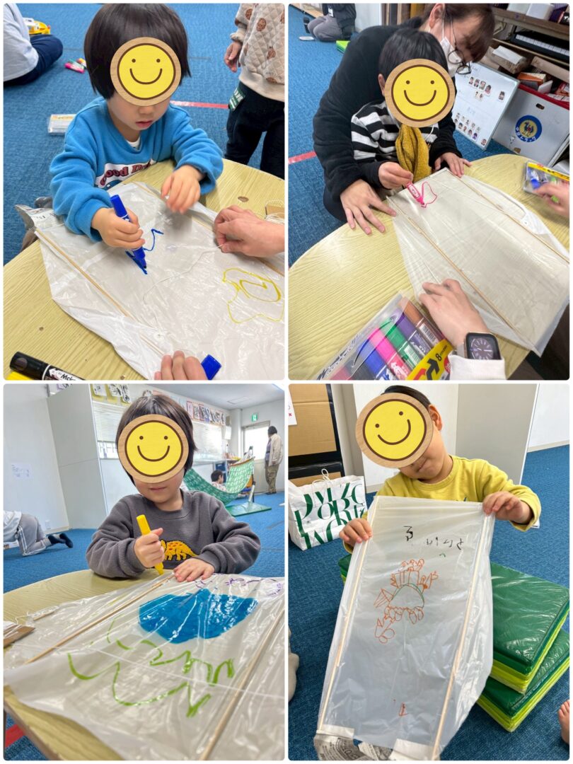 お正月の伝承遊びとして、手作りの凧作りに挑戦しました。 自分で好きな絵や模様や字を書き、形を整える工程では、指先の巧緻性(微細運動)を養います。完成した後は広場へ移動し、力いっぱい駆け回って凧あげを楽しみました。風の抵抗を感じながら走ることで、全身のバランス感覚や協調運動(粗大運動)を刺激し、心身ともに健やかな発散の場となりました。
