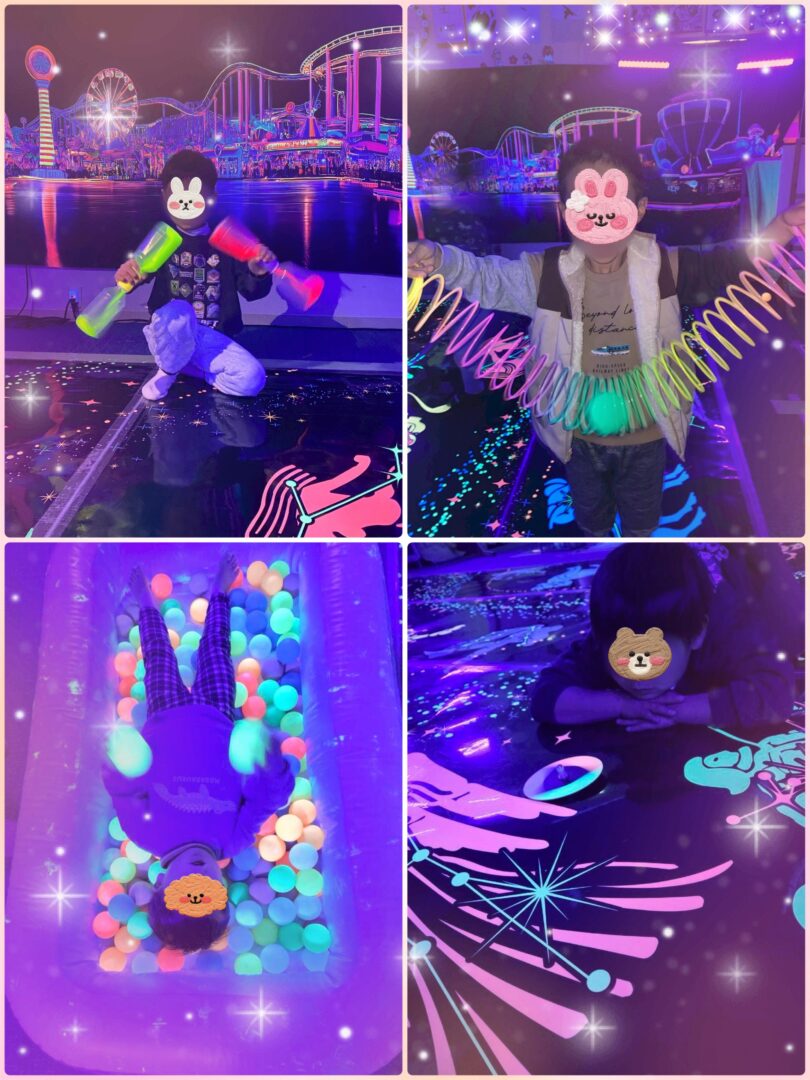 スヌーズレンとは、50年前にヨーロッパのオランダで始まったレクリエーションの名前です。スヌーズレンは人の五感(見る、聴く、触れる、嗅ぐ、味わう)を使って楽しめます。今回のスヌーズレン体験は、ブラックライトを利用して特に「見る」「触れる」で楽しみました😊