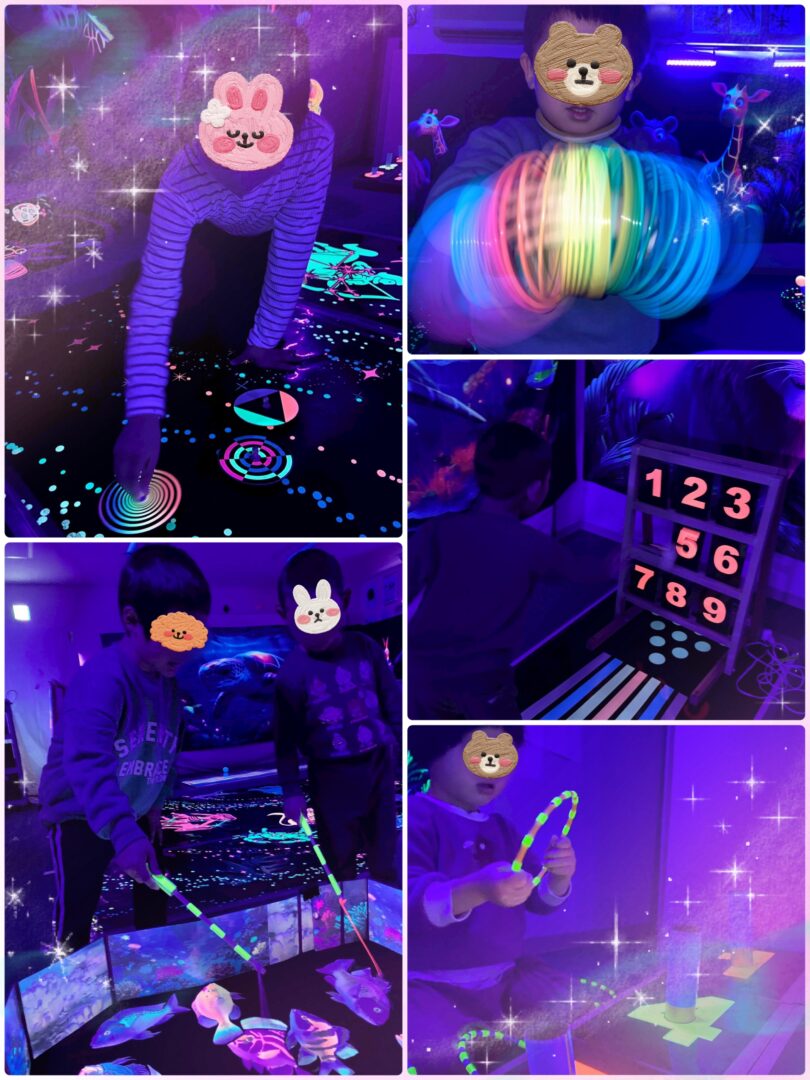スヌーズレンとは、50年前にヨーロッパのオランダで始まったレクリエーションの名前です。スヌーズレンは人の五感(見る、聴く、触れる、嗅ぐ、味わう)を使って楽しめます。今回のスヌーズレン体験は、ブラックライトを利用して特に「見る」「触れる」で楽しみました😊