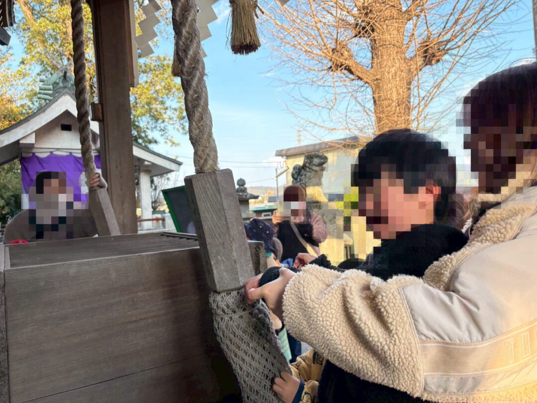 中に入るとみんなで大きなしめ縄の輪っかを八の字に回って神殿前に向かいます!!