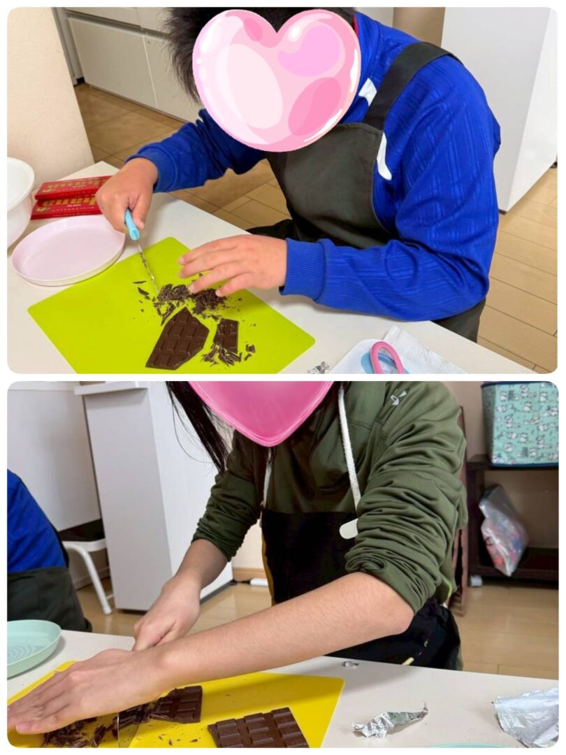 チョコを細かくして溶かすチームとアイシングを作るチームに分かれ調理を開始しました🧑🍳
