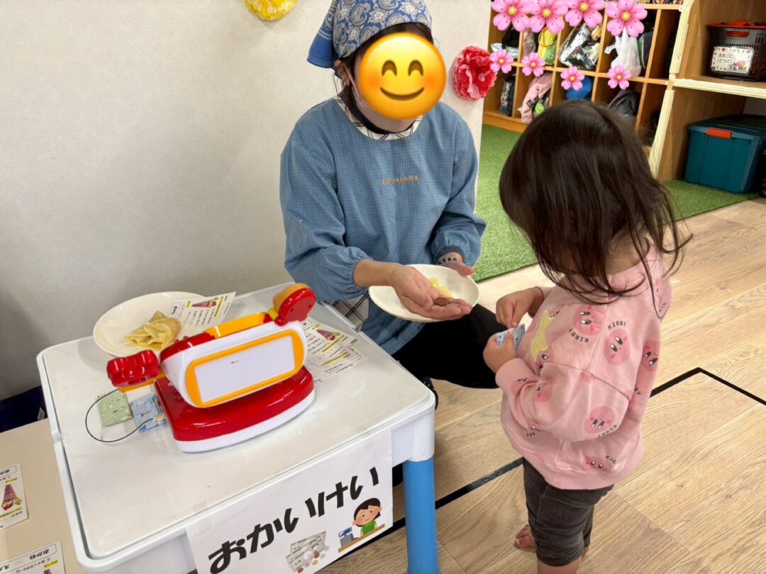 パパさんから何名様ですか?から始まり、メニューを見て金額におさまるようにクレープに入れる果物たちを選んで実際に注文を行い、玩具のお金で払ってみんなでいただきます👐🌠