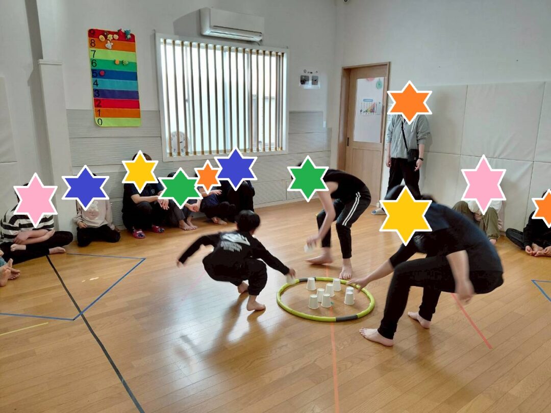 次は、コップ取りバトルをしました。コップを自分の陣地に5個集めた人の勝利です。