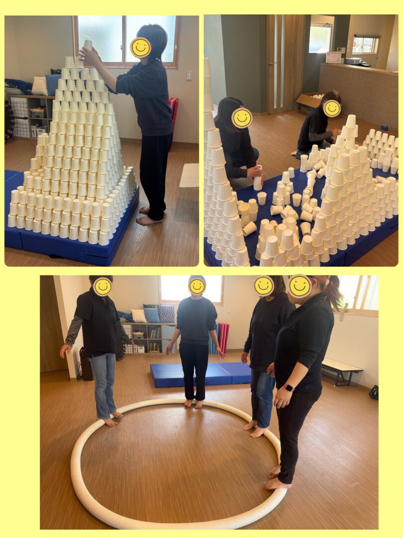 写真はその中の一コマで、2グループに分かれ、紙コップを使って作品を作る対決をしました❕