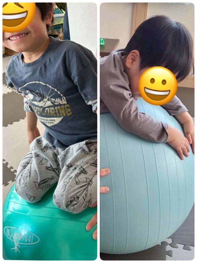 グラグラするボールの上で姿勢を保とうとすることで、無意識にインナーマッスルが鍛えられます💪 姿勢が崩れやすい子の「座る力」をサポートします。